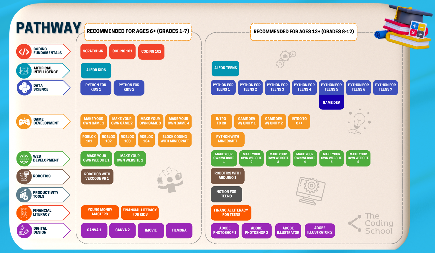 We started as a coding school — and we've grown into so much more. Today, The Coding School offers a wide range of programs for kids, teens, and professionals who are ready to learn and grow.